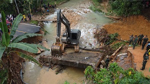 ศูนย์บรรเทาสาธารณภัย กองพลทหารราบที่ 15 ช่วยเหลือผู้ประสบอุทกภัย หลังถนนถูกตัดขาดบริเวณบ้านบายิ ตำบลตลิ่งชัน อำเภอบันนังสตา จังหวัดยะลา