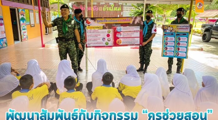 วันที่ 24 พฤศจิกายน 2565 ณ โรงเรียนบ้านใหม่ ตำบลท่าม่วง อำเภอเทพา จังหวัดสงขลา ชุดปฏิบัติการเสริมสร้างความเข้าใจ เข้าพบปะพูดคุยพัฒนาสัมพันธ์กับครูและนักเรียน เพื่อเสริมสร้างความเข้าใจ สร้างความสัมพันธ์อันดีต่อกัน ร่วมกิจกรรม “ครูช่วยสอน” ให้ความรู้ในเรื่องสถาบันชาติ และความรู้เกี่ยวกับยาเสพติด เพื่อให้นักเรียนห่างไกลจากยาเสพติด และใช้เวลาว่างให้เกิดประโยชน์ อีกทั้งยังสร้างรอยยิ้ม สร้างความสุข ให้กับน้องๆนักเรียนและครู