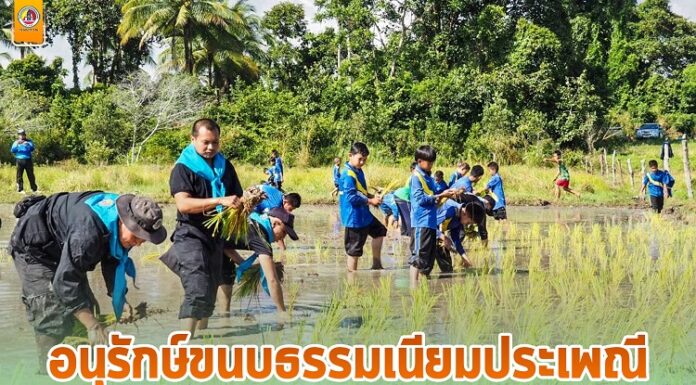 เมื่อวันที่ 8 พฤศจิกายน 2565 เวลา 10.00 น. ณ พื้นที่แปลงเกษตร “โครงการอาหารชุมชนโรงเรียนต้นแบบ (แบบขยายผล)” โรงเรียนบ้านป่าทุ่ง ตำบลบางเก่า อำเภอสายบุรี จังหวัดปัตตานี หน่วยเฉพาะกิจกรมทหารพรานที่ 44 จัดกำลังพลของหน่วย ร่วมกับ ผู้นำศาสนา, ปราชญ์ชาวบ้าน, ส่วนราชการ, บุคคลากรทางการศึกษา และพี่น้องประชาชนในพื้นที่ ตำบลบางเก่า อำเภอสายบุรี เข้าร่วมกิจกรรม “การลงแขกดำนา ปลูกข้าว” เพื่อเป็นการอนุรักษ์ขนบธรรมเนียมประเพณี แบบวิถีชีวิตพื้นบ้าน รวมทั้งเป็นการสืบสานวัฒนธรรมให้อยู่คู่กับท้องถิ่น และเป็นการพัฒนาความสัมพันธ์อันดีระหว่างพี่น้องประชาชนกับเจ้าหน้าที่ในพื้นที่