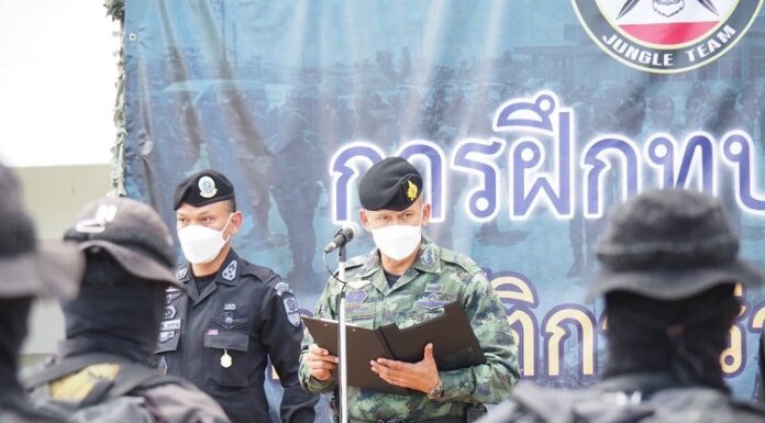 วันนี้ 9 พฤศจิกายน 2565 เวลา 10.00 น. หน่วยเฉพาะกิจนราธิวาส ค่ายกัลยาณิวัฒนา ตำบลกะลุวอ อำเภอเมือง จังหวัดนราธิวาส พันเอก สฐิรพงษ์ อาจหาญ ผู้บังคับกองกำลังทหารพรานจังหวัดชายแดนภาคใต้/ผู้บังคับหน่วยปฏิบัติการพิเศษร่วม ให้การต้อนรับ พลตรี เฉลิมพร ขำเขียว ผู้บังคับหน่วยเฉพาะกิจนราธิวาส ลงพื้นที่เป็นประธานพิธีเปิดการฝึกทบทวนชุดปฏิบัติการพิเศษร่วมป่าภูเขา และร่วมรับฟังการบรรยายสรุปฝึกทบทวนหน่วยปฏิบัติการพิเศษร่วมป่าภูเขา ในการฝึกทบทวนครั้งนี้จัดโดยหน่วยเฉพาะกิจกรมทหารพรานที่ 45 หน่วยเฉพาะกิจกรมทหารพรานที่ 46 ,หน่วยเฉพาะกิจกรมทหารพรานที่ 48 และหน่วยเฉพาะกิจกรมทหารพรานที่ 49 โดยมีผู้เข้ารับการฝึกทั้งสิ้น 72 นาย ตั้งแต่วันที่ 8 ถึง 17 พฤศจิกายน 2565 โดยมี พันเอก สิทธิศักดิ์ เจนบรรจง รองผู้บังคับกองกำลังทหารพรานจังหวัดชายแดนภาคใต้ และ พันเอก ทวีรัตน์ เบญจาธิกุล ผู้บังคับหน่วยเฉพาะกิจกรมทหารพรานที่ 45/ผู้บังคับหน่วยปฏิบัติการพิเศษร่วมป่าภูเขา ร่วมในพิธี
