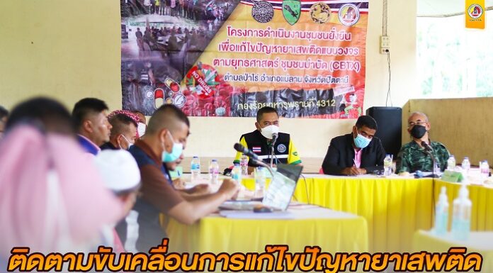 เมื่อวันที่ 8 พฤศจิกายน 2565 ณ ที่ทำการโครงการบำบัดฟื้นฟูโดยการมีส่วนร่วมของชุมชน (CBTx) ตำบลป่าไร่ อำเภอแม่ลาน จังหวัดปัตตานี พันเอก เสฏธวุฒิ จันทนะ ผู้อำนวยการศูนย์ป้องกันและแก้ไขปัญหายาเสพติด กองอำนวยการรักษาความมั่นคงภายในภาค 4 ส่วนหน้า และคณะลงพื้นที่ตรวจเยี่ยมการขับเคลื่อนบำบัดฟื้นฟูโดยการมีส่วนร่วมของชุมชนบำบัดยาเสพติด หรือโครงการบำบัดฟื้นฟูโดยการมีส่วนร่วมของชุมชน CBTx (Community Based Treatment)
