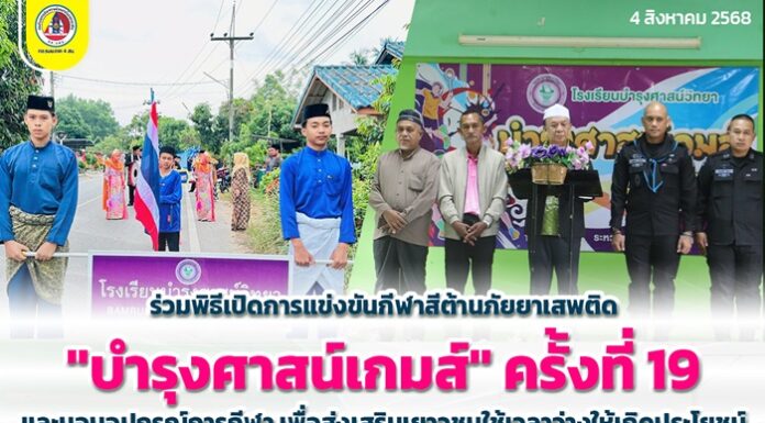 เมื่อวันที่ 3 สิงหาคม 2568 เวลา 09.30 น. พันโท อยุทธ์ รุ่งเรือง รองผู้บังคับหน่วยเฉพาะกิจกรมทหารพรานที่ 41 ร่วมพิธีเปิดการแข่งขันกีฬาสีต้านภัยยาเสพติด “บำรุงศาสน์เกมส์” ครั้งที่ 19 ณ โรงเรียนบำรุงศาสน์วิทยา ตำบลกอตอตือร๊ะ อำเภอรามัน จังหวัดยะลา เพื่อส่งเสริมให้เยาวชนใช้เวลาว่างให้เกิดประโยชน์ สร้างภูมิคุ้มกันและห่างไกลจากยาเสพติด ตลอดจนเสริมสร้างความรัก ความสามัคคี และทักษะการทำงานเป็นทีมผ่านการเล่นกีฬา อีกทั้งยังเป็นการสนับสนุนสถาบันการศึกษาในการพัฒนาศักยภาพของนักเรียนทั้งด้านร่างกาย จิตใจ และคุณธรรม