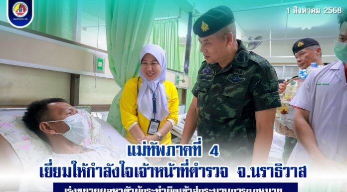 วันที่ 31 กรกฎาคม 2568 เวลา 15.00 น. พลโท ไพศาล หนูสังข์ แม่ทัพภาคที่ 4 / ผู้อำนวยการรักษาความมั่นคงภายในภาค 4 พร้อมคณะผู้บังคับบัญชาและหน่วยงานที่เกี่ยวข้อง ลงพื้นที่โรงพยาบาลสุไหงปาดี อำเภอสุไหงปาดี จังหวัดนราธิวาส เข้าเยี่ยมให้กำลังใจและติดตามอาการบาดเจ็บเจ้าหน้าที่ตำรวจ กองกำลังตำรวจนราธิวาสที่บาดเจ็บจากการปฎิบัติหน้าที่ขณะตั้งจุดตรวจจุดสกัดบริเวณถนนสายสากอ-แว้ง เมื่อวันที่ 30 กรกฎาคม 2568 ที่ผ่านมา จำนวน 6 นาย ขณะนี้ทุกนายพ้นขีดอันตรายและอยู่ในความดูแลของทีมแพทย์อย่างใกล้ชิด ดังนี้