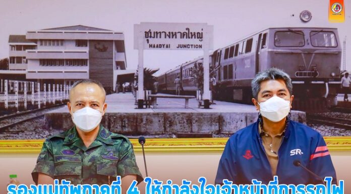 วันนี้ (6 สิงหาคม 2565) ณ ห้องประชุมศูนย์ปฏิบัติการเดินรถภาค 4 การรถไฟแห่งประเทศไทย (ศปร.4 รฟท.) อำเภอหาดใหญ่ จังหวัดสงขลา พลตรี อุทิศ อนันตนานนท์ รองแม่ทัพภาค 4 / รองผู้อำนวยการรักษาความมั่นคงภายในภาค 4 ส่วนหน้า และคณะ เยี่ยมพบปะให้กำลังใจและร่วมหารือกับ นายสุชีพ สุขสว่าง รองผู้ว่าการกลุ่มธุรกิจการเดินรถ การรถไฟแห่งประเทศไทย เพื่อติดตามผลการปฏิบัติงาน และปรับแนวทางป้องกันเหตุการณ์ให้รัดกุมเข้มแข็ง โดยมี ผู้อำนวยการศูนย์ปฏิบัติการเดินรถภาค 4, เจ้าหน้าที่รักษาความปลอดภัยรัฐวิสาหกิจ ส่วนของการไฟฟ้า และส่วนที่เกี่ยวข้องร่วมให้การต้อนรับ
