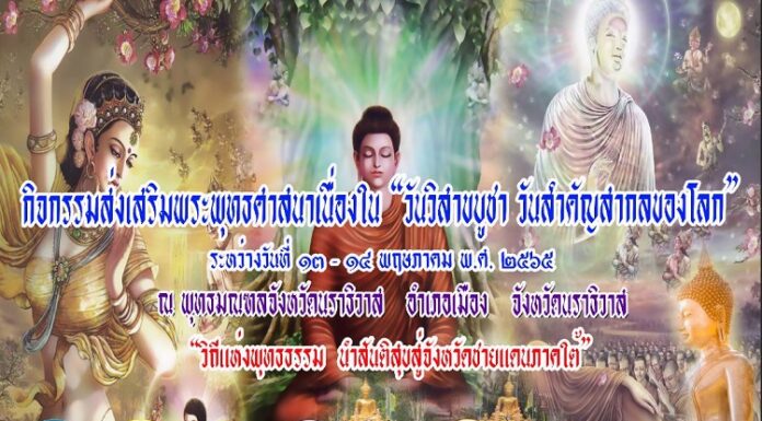 ขอเชิญร่วมกิจกรรมส่งเสริมพระพุทธศาสนา “วันวิสาขบูชา วันสำคัญของโลก” ตั้งแต่วันที่ 13 – 14 พฤษภาคม 2565 ณ พุทธมณฑลจังหวัดนราธิวาส (เขากง) อำเภอเมือง จังหวัดนราธิวาส