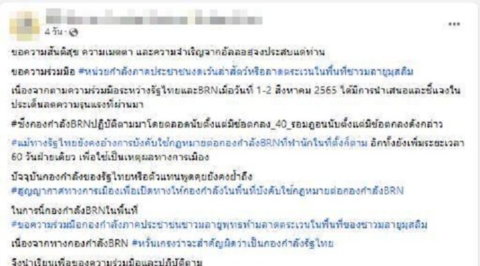 จากกรณีคนร้ายได้ใช้อาวุธปืนสงครามยิงประชาชนหาของป่าเสียชีวิต 2 ราย ในพื้นที่ ต.โต๊ะเด็ง อ.สุไหงปาดี จ.นราธิวาส เหตุเกิดเมื่อวันที่ 3 ส.ค. 2565 และต่อมาเมื่อวันที่ 5 ส.ค. 2565 ได้มีเพจเฟสบุ๊คที่อ้างว่าเป็นเพจของกลุ่มขบวนการ BRN. ได้ออกมาโพสต์ข้อความ “ขอความร่วมมือหน่วยกำลังภาคประชาชน งดเว้นล่าสัตว์หรือลาดตระเวนในพื้นที่ชาวมลายูมุสลิม เพื่อป้องกันการเข้าใจผิดว่าเป็นเจ้าหน้าที่รัฐ”และต่อมาภายหลังได้มีการนำเสนอข่าวในรายการ “ข่าวข้น คนข่าว” ของสถานีโทรทัศน์เดอะเนชั่น และมีการแชร์ประเด็นดังกล่าวออกไปอย่างกว้างขวาง