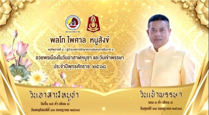 แม่ทัพภาคที่ 4 เชิญชวนพุทธศาสนิกชน ร่วมตั้งจิตน้อมใจ เข้าวัดฟังธรรม ลด ละ เลิก อบายมุข และ เข้าร่วมกิจกรรมต่าง ๆ ทางพระพุทธศาสนา เพื่อถวายเป็นพุทธบูชา เนื่องในวันอาสาฬหบูชาและวันเข้าพรรษา ประจำปี 2568
