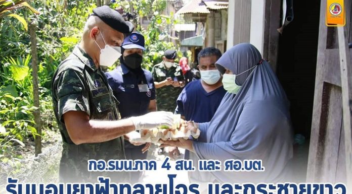 กอ.รมน.ภาค 4 สน. และ ศอ.บต. รับมอบยาแคปซูลฟ้าทลายโจร และกระชายขาว จากบริษัท ธนัทเฮิร์บพานิชย์ จำกัด และสถานีโทรทัศน์เนชั่นทีวี ช่วง covid-19 ก่อนเดินหน้าส่งต่อให้กับประชาชนในพื้นที่ จชต.