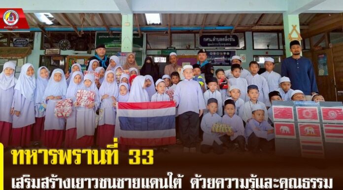 วันที่ 21 มิถุนายน 2568 หน่วยเฉพาะกิจกรมทหารพรานที่ 33 โดยกองร้อยทหารพรานที่ 3308 นำกำลังพลชุดปฏิบัติการกิจการพลเรือน ลงพื้นที่โรงเรียนตาดีกามานะศาสน์วิทยา บ้านยีลาปัน หมู่ที่ 11 ตำบลตลิ่งชัน อำเภอบันนังสตา จังหวัดยะลา เพื่อพบปะและสร้างความสัมพันธ์อันดีระหว่างเจ้าหน้าที่ทหารกับคณะครู อาจารย์ และนักเรียนในพื้นที่ พร้อมทั้งเสริมสร้างองค์ความรู้และปลูกฝังจิตสำนึกที่ดีให้แก่เยาวชน โดยเฉพาะในด้านประวัติศาสตร์ชาติไทยและคุณค่าของความเป็นไทย หน่วยทหารพรานได้บรรยายให้ความรู้เกี่ยวกับประวัติศาสตร์และความเป็นมาของ “ธงชาติไทย” พร้อมอธิบายถึงความหมายของสีทั้งสาม และบทบาทสำคัญของธงชาติในฐานะสัญลักษณ์แห่งความเป็นชาติ เพื่อให้เยาวชนตระหนักถึงความสำคัญและภาคภูมิใจในความเป็นไทย