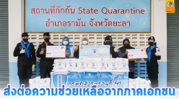 หน่วยเฉพาะกิจกรมทหารพรานที่ 41 จัดกำลังพล ชุดปฏิบัติการเสริมสร้างความเข้าใจ นำข้าวสารที่รับมอบจากหน่วยเฉพาะกิจยะลา จำนวน 400 ถุง เพื่อส่งมอบให้กับบุคลากรทางการแพทย์ และผู้ป่วยที่ถูกกักกันเข้าพักสังเกตอาการ covid-19 ใน State Quarantine ของอำเภอรามัน ทั้ง 2 แห่ง ประกอบด้วย State Quarantine โรงเรียนดารุลฮูดาห์วิทยา หมู่ที่ 1 และ State Quarantine โรงเรียนราชประชานุเคาะห์ 41 หมู่ที่ 2 ตำบลวังพญา อำเภอรามัน จังหวัดยะลา