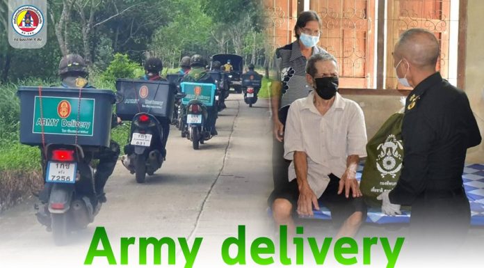 พลตรี ฐกร เนียมรินทร์ ผู้บัญชาการกองบัญชาการช่วยรบที่ 4 พร้อมด้วย พันเอกหญิง จิดาภา เนียมรินทร์ ประธานสมาคมแม่บ้านทหารบก สาขา กองบัญชาการช่วยรบที่ 4 จัดกิจกรรม Army delivery เพื่อนำสิ่งของ อุปโภค - บริโภค หน้ากากอนามัย และเจลล้างมือ ไปมอบให้กับผู้ป่วยติดเตียง ที่ได้รับผลกระทบจากสถานการณ์การแพร่ระบาดของเชื้อไวรัสโควิด-19 บ้านควนแต้ว หมู่ที่ 7 ตำบลกะปาง อำเภอทุ่งสง จังหวัดนครศรีธรรมราช จำนวน 4 หลัง โดยใช้รถจักรยานยนต์ Army delivery จำนวน 8 คัน สร้างรอยยิ้มและความรู้สึกให้กับประชาชนได้เป็นอย่างดี ณ บ้านควนแต้ว หมู่ที่ 7 ตำบลกะปาง อำเภอทุ่งสง จังหวัดนครศรีธรรมราช