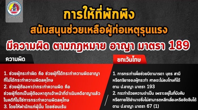 การให้ที่พักพิง หรือสนับสนุนช่วยเหลือผู้ก่อเหตุรุนแรง มีความผิด ตามกฎหมายอาญา มาตรา 189