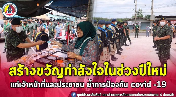 วันที่ 31 ธันวาคม 2563 เวลา 14.30 น. ที่ เขตเทศบาลตำบลสะบ้าย้อย อำเภอสะบ้าย้อย จังหวัดสงขลา พลโท พรชัย อินทนู รองผู้อำนวยการรักษาความมั่นคงภายในภาค 4 ส่วนหน้า และคณะเดินทางลงพื้นที่ตรวจเยี่ยม สร้างขวัญกำลังใจแก่เจ้าหน้าที่ที่ปฏิบัติหน้าที่ช่วงเทศกาลขึ้นปีใหม่ 2564 พร้อมพบปะเยี่ยมเยียนให้กำลังใจพี่น้องประชาชน เยี่ยมผู้ประกอบการร้านค้า ประชาสัมพันธ์สร้างความตระหนักในมาตรการป้องกันการแพร่ระบาดของ เชื้อไวรัส covid - 19 โดยได้มอบหน้ากากอนามัย และเจลแอลกอฮอล์ให้แก่ประชาชนในพื้นที่