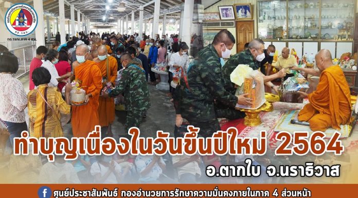 รอง.ผอ.รมน.ภาค 4 สน. นำพุทธศาสนิกชนชาว อ.ตากใบ จ.นราธิวาส ร่วมทำบุญตักบาตร เนื่องในวันขึ้นปีใหม่ 2564