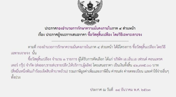 ประกาศผู้ชนะการเสนอราคา จัดซื้อเครื่องแต่งกายของ ศสว. ประจำปีงบประมาณ ๒๕๖๔ โดยวิธีคัดเลือก (1,015,938.00)