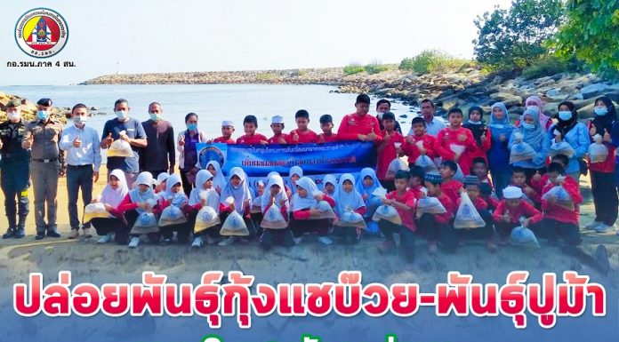 อำเภอไม้แก่น จังหวัดปัตตานี จัดกิจกรรมปล่อยพันธุ์กุ้งแชบ๊วย-พันธุ์ปูม้า รวม 8 แสนตัวลงสู่ทะเล