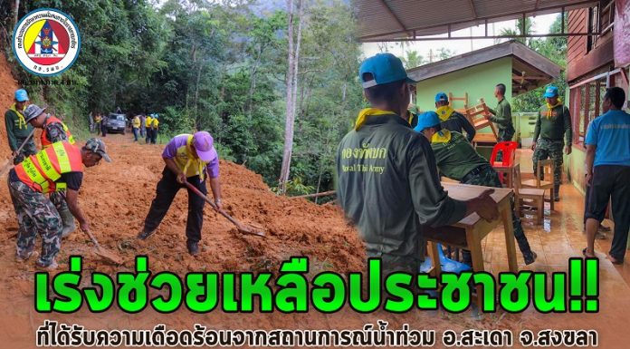 กองพลพัฒนาที่ 4 ลงพื้นที่ช่วยเหลือประชาชนที่ได้รับความเดือดร้อนจากสถานการณ์น้ำท่วมในพื้นที่อำเภอสะเดา จังหวัดสงขลา โดยการจัดกำลังพลเร่งช่วยเหลือประชาชนเปิดเส้นทางพื้นที่ดินโคลนถล่ม จำนวน 2 เส้นทาง ในพื้นที่หมูที่ 6 ตำบลสำนักแต้ว อำเภอสะเดา จังหวัดสงขลา เพื่อให้ประชาชนสามารถสัญจรเข้าออกหมู่บ้านได้