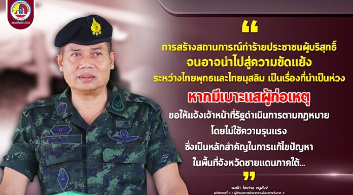 “…การสร้างสถานการณ์ทำร้ายประชาชนผู้บริสุทธิ์ จนอาจนำไปสู่ความขัดแย้งระหว่างไทยพุทธและไทยมุสลิม เป็นเรื่องที่น่าเป็นห่วง หากมีเบาะแสผู้ก่อเหตุ ขอให้แจ้งเจ้าหน้าที่รัฐดำเนินการตามกฎหมายโดยไม่ใช้ความรุนแรง ซึ่งเป็นหลักสำคัญในการแก้ไขปัญหาในพื้นที่จังหวัดชายแดนภาคใต้…”