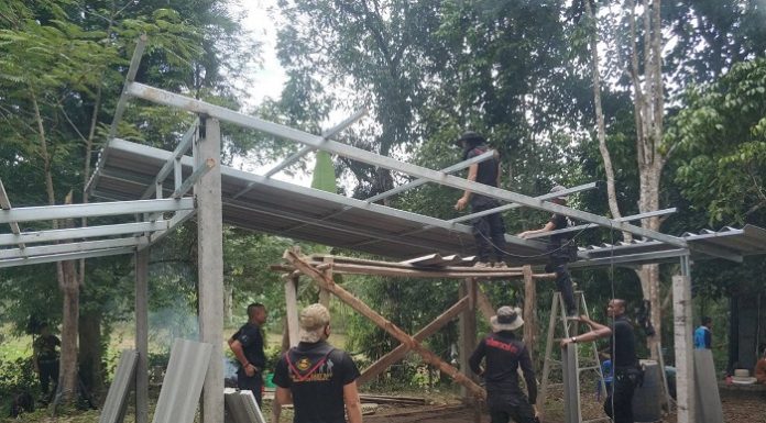 เมื่อวันที่ 3 ส.ค.63 เวลา 08.00 – 16.30 น. หน่วยเฉพาะกิจกรมทหารพรานที่ 33 จัดกำลังพลชุดช่าง จากกองร้อยทหารพรานที่ 4714 ร่วมกับ ผู้ใหญ่บ้าน, ผู้นำหมู่บ้าน, อาสาสมัครสาธารณสุขประจำหมู่บ้าน (อสม.), ลูกจ้างฯ เเละประชาชน ร่วมดำเนินการก่อสร้างบ้านให้กับ นางรอมล๊ะ สานา ซึ่งเป็นผู้ยากไร้ ตามโครงการ “หน่วยเฉพาะกิจยะลา ไม่ทิ้งท่าน” ซึ่งหน่วยได้ดำเนินการเป็นหลังที่ ๒ ณ บ้านตะโล๊ะรีบู (บริวาร บ.บาโงยีรา) หมู่ ๑ ตำบลสะเอะ อำเภอกรงปินัง จังหวัดยะลา โดยทำการขึ้นโครงหลังคาและมุงกระเบื้อหลังคา ปัจจุบันดำเนินการไปเเล้ว ประมาณ ๒๐ เปอร์เซ็นต์