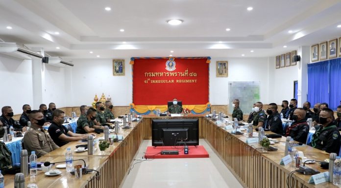 วันนี้ 26 ตุลาคม 2563 ณ ห้องประชุมเจนบรรจง หน่วยเฉพาะกิจกรมทหารพรานที่ 41 ตำบลวังพญา อำเภอรามัน จังหวัดยะลา พลโท เกรียงไกร ศรีรักษ์ แม่ทัพภาคที่ 4 / ผู้อำนวยการรักษาความมั่นคงภายในภาค 4 เป็นประธานประชุม แผนรักษาความปลอดภัยวันเชิงสัญลักษณ์ เหตุการณ์วันสำคัญต่าง ๆ ของกลุ่มขบวนการ เพื่อติดตามและเน้นย้ำแผนการรักษาความปลอดภัยในเขตพื้นที่รับผิดชอบของหน่วยเฉพาะกิจยะลา โดยผนึกกำลังทุกภาคส่วน บูรณาการทำงานทั้ง 3 ฝ่าย ทหาร ตำรวจ และฝ่ายปกครอง โดยมี พลตรี อุทิศ อนันตนานนท์ ผู้บังคับหน่วยเฉพาะกิจยะลา พร้อมด้วยผู้บังคับหน่วย เจ้าหน้าที่หน่วยปฏิบัติการพิเศษร่วมจังหวัดยะลา หน่วยปฏิบัติการพิเศษร่วมช่วยส่วนรวม ตลอดจนกำลังพลเจ้าหน้าที่ที่เกี่ยวข้อง เข้าร่วมประชุมรับฟังนโยบาย แผนการปฏิบัติอย่างพร้อมเพรียง