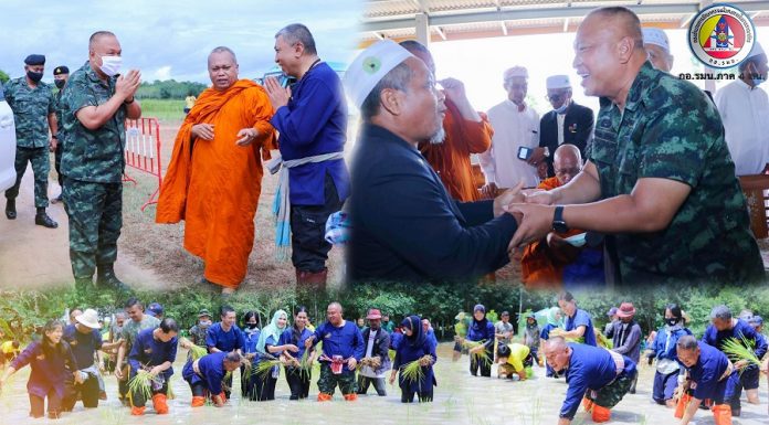 วันนี้ (16 ตุลาคม 2563) เวลา 10.00 น. ณ ศูนย์เรียนรู้พระอาจารย์ภัตร อริโย หมู่ที่ 3 ตำบลนาหมอศรี อำเภอนาทวี จังหวัดสงขลา พลโท เกรียงไกร ศรีรักษ์ แม่ทัพภาคที่ 4/ผู้อำนวยการรักษาความมั่นคงภายในภาค 4 เป็นประธานเปิดกิจกรรม“พลิกนาร้าง เป็นนารักษ์ ปีที่ 3” เพื่อส่งเสริมความเข้มแข็งของชุมชนภายใต้สังคมพหุวัฒนธรรม รวมถึงส่งเสริมให้เกษตรกรในพื้นที่ทั้งชาวไทยพุทธและชาวไทยมุสลิมร่วมกันฟื้นฟูนาข้าวที่ถูกทิ้งร้างให้กลับมาทำนาข้าวได้อีกครั้ง โดยมี นายจารุวัฒน์ เกลี้ยงเกลา ผู้ว่าราชการจังหวัดสงขลา พร้อมด้วยหัวหน้าส่วนราชการ ส่วนราชการระดับอำเภอ เจ้าหน้าที่จากหน่วยเฉพาะกิจตำรวจตระเวนชายแดนที่ 43 ผู้นำศาสนา ผู้นำท้องถิ่น กลุ่มเกษตรกร นักเรียน และประชาชนในพื้นที่เข้าร่วมกว่า 3,500 คน พร้อมกันนี้ยังได้ร่วมปล่อยพันธุ์ปลาลงสู่แหล่งน้ำและดำนาร่วมกับประชาชน