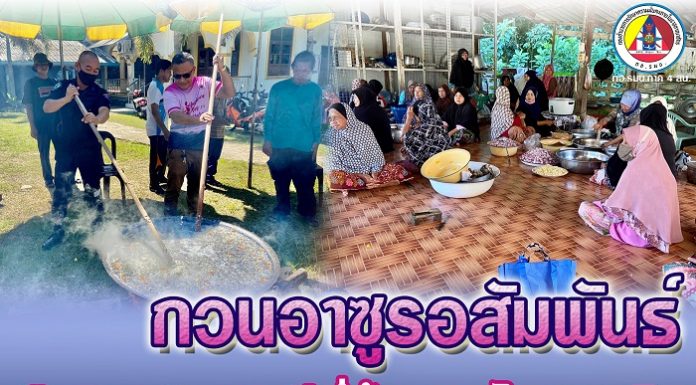 ขณะที่บรรยากาศเป็นไปอย่างคึกคัก ด้วยความสามัคคีของทุกคน ซึ่งได้มาร่วมแรง ร่วมใจ อย่างขะมักเขม้นในการกวนอาซูรอ โดยจะแบ่งหน้าที่กันทั้งหั่น ปอก ส่วนประกอบของอาซูรอ กล้วย มันเทศ หอมแดง และอื่น ๆ พร้อมทั้งช่วยกันใช้ไม้พายกวนส่วนผสมของขนมอาซูรอในกระทะ เพื่อให้อาซูรอแห้งก่อนที่จะนำมาตกแต่งหน้า