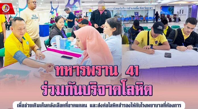 ทหารพราน 41 ร่วมกันบริจาคโลหิต เพื่อช่วยเติมเต็มคลังเลือดที่ขาดแคลน และส่งต่อโลหิตสำรองให้กับโรงพยาบาลที่ต้องการ