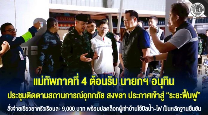 แม่ทัพภาคที่ 4 ต้อนรับ นายกฯ อนุทิน ประชุมติดตามสถานการณ์อุทกภัย สงขลา ประกาศเข้าสู่ “ระยะฟื้นฟู” สั่งจ่ายเยียวยาครัวเรือนละ 9,000 บาท พร้อมปลดล็อกผู้เช่าบ้านใช้บิลน้ำ-ไฟ เป็นหลักฐานยืนยัน