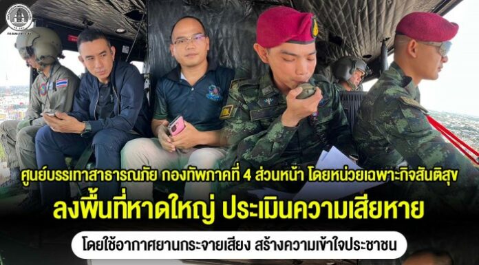 กองอำนวยการรักษาความมั่นคงภายในภาค 4 ส่วนหน้า เดินหน้าประชาสัมพันธ์ทางอากาศยาน บินกระจายเสียงให้การช่วยเหลือ สร้างการรับรู้แก่ประชาชนอย่างต่อเนื่อง จนกว่าสถานการณ์จะเข้าสู่ภาวะปกติ