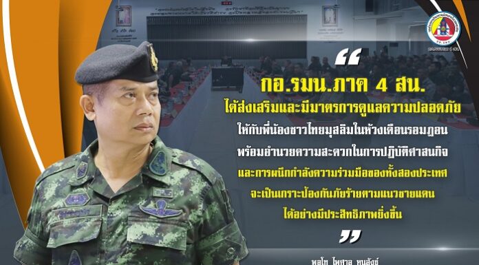 “กอ.รมน.ภาค 4 สน. ได้ส่งเสริมและมีมาตรการดูแลความปลอดภัย ให้กับพี่น้องชาวไทยมุสลิมในห้วงเดือนรอมฎอน พร้อมอำนวยความสะดวกในการปฏิบัติศาสนกิจ และการผนึกกำลังความร่วมมือของทั้งสองประเทศ จะเป็นเกราะป้องกันภัยร้ายตามแนวชายแดน ได้อย่างมีประสิทธิภาพยิ่งขึ้น”