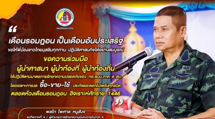 “…เดือนรอมฎอน เป็นเดือนอันประเสริฐ ขอให้พี่น้องชาวไทยมุสลิมทุกท่าน ปฏิบัติศาสนกิจได้อย่างสมบูรณ์ ขอความร่วมมือ ผู้นำศาสนา ผู้นำท้องที่ ผู้นำท้องถิ่น ได้ปฏิบัติตามมาตรการรักษาความปลอดภัยของ กอ.รมน.ภาค 4 สน. โดยเฉพาะการงด ซื้อ-ขาย-ใช้ ประทัดและดอกไม้เพลิงทุกชนิด ตลอดห้วงเดือนรอมฎอน ฮิจเราะห์ศักราช 1446…”