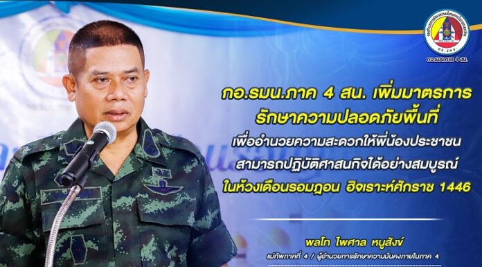 “…กอ.รมน.ภาค 4 สน. เพิ่มมาตรการรักษาความปลอดภัยพื้นที่ เพื่ออำนวยความสะดวกให้พี่น้องประชาชนสามารถปฏิบัติศาสนกิจได้อย่างสมบูรณ์ในห้วงเดือนรอมฏอน ฮิจเราะห์ศักราช 1446…”