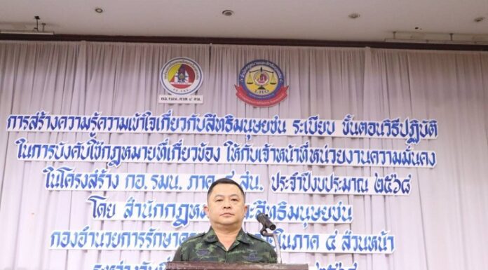 สำนักกฎหมายและสิทธิมนุษยชน กองอำนวยการรักษาความมั่นคงภายในภาค 4 ส่วนหน้า จัดการอบรมเสริมสร้างความรู้ความเข้าใจเกี่ยวกับหลักสิทธิมนุษยชน ระเบียบ ขั้นตอนวิธีการปฏิบัติการบังคับใช้กฎหมายที่เกี่ยวข้อง ให้กับให้กับเจ้าหน้าที่หน่วยงานความมั่นคงในโครงสร้างกองอำนวยการรักษาความมั่นคงภายในภาค 4 ส่วนหน้า ประจำปีงบประมาณ 2568 งวดที่ 1 (ครั้งที่ 2) ในวันนี้ (24 กุมภาพันธ์ 2568) เวลา 09.00 น.ที่ โรงแรมบีพี สมิหลา บีช รีสอร์ท ตำบลบ่อยาง อำเภอเมือง จังหวัดสงขลา พันเอก มานะ ปริญญาศิริ ผู้อำนวยการสำนักกฎหมายและสิทธิมนุษยชน กองอำนวยการรักษาความมั่นคงภายในภาค 4 ส่วนหน้า เป็นประธานพิธีเปิดการอบรมฯ เพื่อให้เจ้าหน้าที่มีความเข้าใจในหลักสิทธิมนุษยชน ควบคู่กับการปฏิบัติหน้าที่การบังคับใช้กฎหมายให้เกิดผลสัมฤทธิ์สูงสุด เพราะถือเป็นถือเป็นกลไกสำคัญของทุกหน่วย ทั้งนี้การอบรมฯ มีกิจกรรมต่าง ๆ อาทิ การรับฟังการบรรยายความรู้ในข้อกฎหมายจากวิทยากร รวมทั้งการถกแถลงแลกเปลี่ยนความคิดเห็นประสบการณ์ระหว่างกันในการแบ่งกลุ่ม ตลอดจนการแถลงผลการอบรมที่เป็นผลมาจากการแลกเปลี่ยนความรู้ประสบการณ์ดังกล่าว และการประเมินผลก่อนและหลังการอบรมเพื่อให้คณะผู้จัดการอบรม สามารถนำผลลัพธ์ที่ได้และผลการประเมินไปเป็นข้อมูลสำคัญในการกำหนดแนวทางการจัดการอบรมให้ความรู้ด้านกฎหมายได้อย่างมีประสิทธิภาพต่อไป โดยมี ผู้เข้าร่วมอบรมฯ ประกอบด้วย ข้าราชการทหาร ตำรวจ ที่ปฏิบัติงานอยู่ภายใต้โครงสร้างของ กองอำนวยการรักษาความมั่นคงภายในภาค 4...
