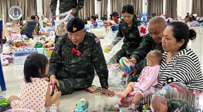 วันนี้ (28 พฤศจิกายน 2568) เวลา 12.30 น. ที่ ศูนย์พักพิงชั่วคราว มณฑลทหารบกที่ 42 ค่ายเสนาณรงค์ อำเภอหาดใหญ่ จังหวัดสงขลา พันเอก ยุทธนาม เพชรม่วง โฆษก กองอำนวยการรักษาความมั่นคงภายในภาค 4 ส่วนหน้า พร้อมด้วย พันเอก ธนุตม์ พิศาลสิทธิวัฒน์ รองบัญชาการมณฑลทหารบกที่ 42 ลงพื้นที่มอบของเล่นเด็ก และตุ๊กตาให้กับน้อง ๆ ภายในศูนย์ พักพิงชั่วคราวฯ เพื่อเติมรอยยิ้ม เพิ่มความสุขให้ผู้ประสบอุทกภัย
