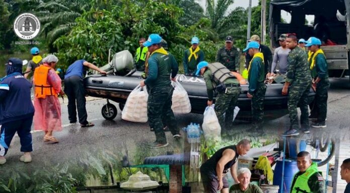 หน่วยทหาร ร.152 พัน.3 ยังคงเร่งช่วยน้ำท่วม แจกอาหาร น้ำดื่ม ชาวบ้านทุ่งเหรียงในพื้นที่จังหวัด ยะลา