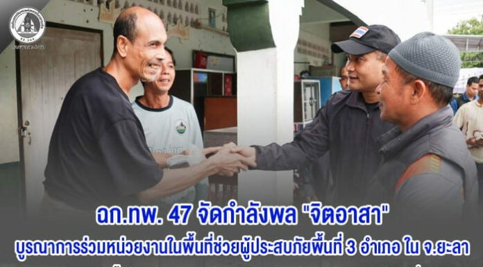 ฉก.ทพ. 47 จัดกำลังพล “จิตอาสา” บูรณาการร่วมหน่วยงานในพื้นที่ช่วยผู้ประสบภัยพื้นที่ 3 อำเภอ ใน จ.ยะลา ภาพรวมสถานการณ์น้ำท่วมหนักกระทบ 8 อำเภอ ทุกภาคส่วนยืนยันพร้อมช่วยเหลือต่อเนื่อง 24 ชม.