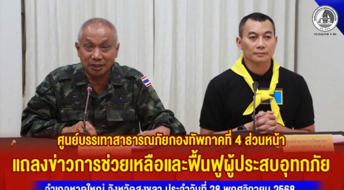 ศูนย์บรรเทาสาธารณภัยกองทัพภาคที่ 4 ส่วนหน้า แถลงข่าวการช่วยเหลือและฟื้นฟูผู้ประสบอุทกภัย อำเภอหาดใหญ่ จังหวัดสงขลา ประจำวันที่ 28 พฤศจิกายน 2568