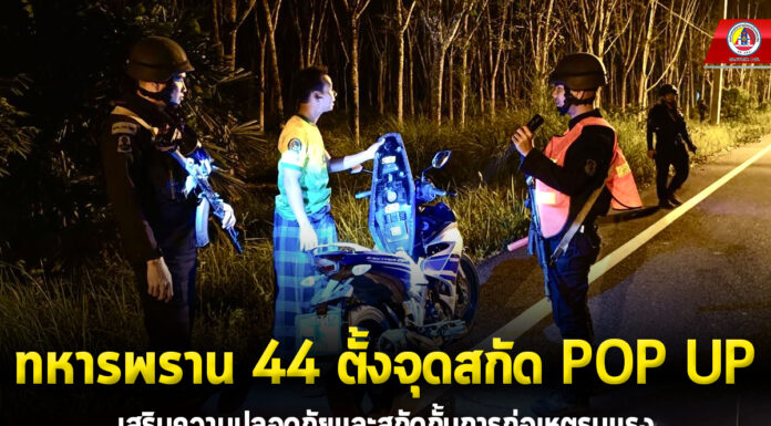 หน่วยเฉพาะกิจกรมทหารพรานที่ 44 โดยร้อย หน่วยขึ้นตรงได้ดำเนินการตั้งจุดตรวจ/จุดสกัด POP UP ในช่วงเวลากลางคืนตามแผนการเชิงรุก พื้นที่ เพื่อเสริมสร้างความปลอดภัยและอำนวยความสะดวกแก่ประชาชนในการสัญจรบนเส้นทางสายหลักและรองในพื้นที่ ตลอดจนเพื่อจัดการกับความเสี่ยงจากกลุ่มผู้ก่อเหตุรุนแรง ที่อาจเข้ามาก่อเหตุ จุดสกัดดังกล่าวตั้งขึ้นในพื้นที่อำเภอที่สำคัญ ได้แก่ อำเภอสายบุรี, อำเภอทุ่งยางแดง, อำเภอกะพ้อ และอำเภอไม้แก่น จังหวัดปัตตานี ซึ่งเป็นเส้นทางที่มีการเดินทางของประชาชนจำนวนมากทั้งในช่วงเวลากลางวันและกลางคืน โดยจุดสกัด POP UP จะช่วยให้เจ้าหน้าที่สามารถตรวจสอบและคัดกรองบุคคลภายนอกที่เดินทางเข้ามาในพื้นที่รับผิดชอบได้อย่างมีประสิทธิภาพ