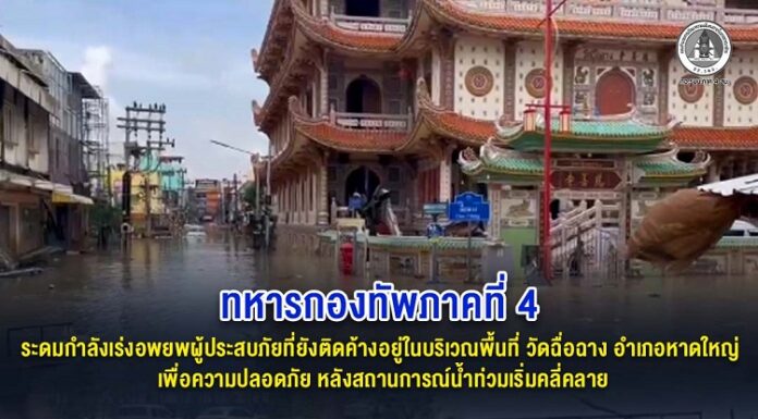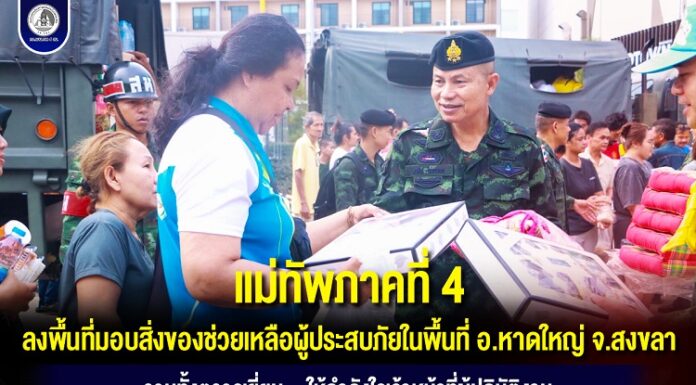 แม่ทัพภาคที่ 4 ลงพื้นที่มอบสิ่งของช่วยเหลือผู้ประสบภัยในพื้นที่ อ.หาดใหญ่ จ.สงขลา รวมทั้งตรวจเยี่ยม – ให้กำลังใจเจ้าหน้าที่ผู้ปฏิบัติงาน ณ ศูนย์บรรเทาสาธารณภัยกองทัพภาคที่ 4 ส่วนหน้า (ส่วนแยกประจำโซน)