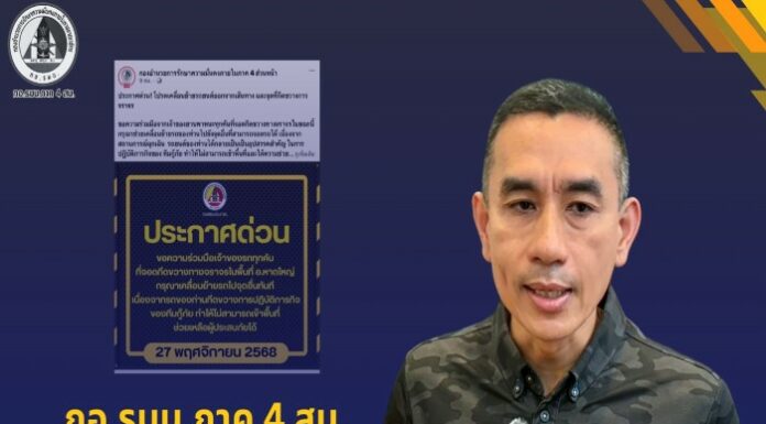 กอ.รมน.ภาค 4 สน. ชี้แจงกรณี Facebook กองอำนวยการรักษาความมั่นคงภายในภาค 4 ส่วนหน้า โพสประกาศ ขอความร่วมมือให้ประชาชนในพื้นที่อำเภอหาดใหญ่ เคลื่อนย้ายรถยนต์ออกจากเส้นทาง และจุดที่กีดขวางการจราจร