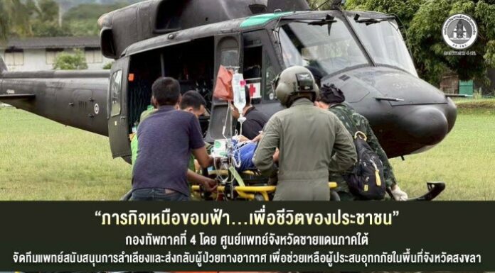 กองทัพภาคที่ 4 โดยศูนย์แพทย์จังหวัดชายแดนภาคใต้ ระดมกำลังทีมแพทย์-พยาบาล เข้าสนับสนุนการลำเลียงและส่งกลับผู้ป่วยทางอากาศอย่างเร่งด่วน หลังสถานการณ์อุทกภัยในจังหวัดสงขลา ทำให้การเดินทางภาคพื้นดินหลายเส้นทางถูกตัดขาด เฮลิคอปเตอร์ลำเลียงเข้าถึงพื้นที่ประสบภัยทันที เพื่อรับผู้ป่วยที่ต้องได้รับการดูแลรักษา พร้อมอุปกรณ์การแพทย์ครบชุด โดยยึดหลัก “เวลาเพียงเสี้ยววินาที…คือความหวังของชีวิต”