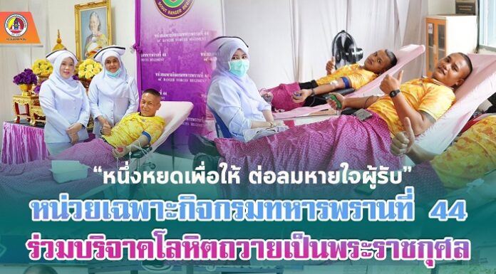 “หนึ่งหยดเพื่อให้ ต่อลมหายใจผู้รับ” หน่วยเฉพาะกิจกรมทหารพรานที่ 44 ร่วมบริจาคโลหิตถวายเป็นพระราชกุศล