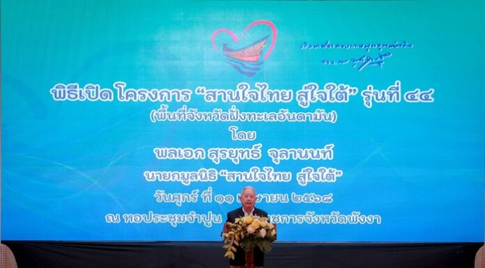 วันที่ 11 เมษายน 2568 เวลา 14.00 น. ณ หอประชุมจำปูน ศูนย์ราชการจังหวัดพังงา อำเภอเมือง จังหวัดพังงา มูลนิธิสานใจไทยสู่ใจใต้ นำโดย พลเอก สุรยุทธ์ จุลานนท์ นายกมูลนิธิฯ ได้เป็นประธานในพิธีเปิดกิจกรรม “สานใจไทย สู่ใจใต้” รุ่นที่ 44 โดยมี พลโท ไพศาล หนูสังข์ แม่ทัพภาคที่ 4/ ผู้อำนวยการรักษาความมั่นคงภายในภาค 4 ให้การต้อนรับและร่วมพิธีอย่างอบอุ่น