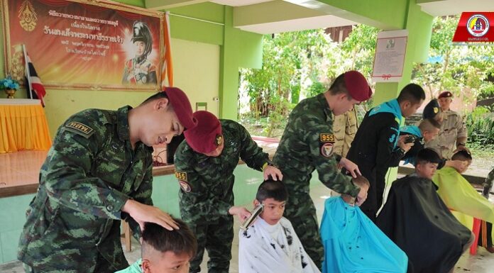 ทหารหมวกแดง จัดกิจกรรมปันน้ำใจ ช่วยภัยน้ำท่วม ช่วยเหลือประชาชน ออกบริการตัดผมฟรีให้เด็กนักเรียนในโรงเรียน