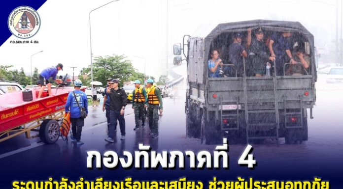 วันที่ 25 พฤศจิกายน 2568 เวลา 12.00 น. พันเอก เอกวริทธิ์ ชอบชูผล รองโฆษกกองอำนวยการรักษาความมั่นคงภายในภาค 4 ส่วนหน้า นำกำลังพลร่วมกับหน่วยงานที่เกี่ยวข้อง ลงพื้นที่อำเภอหาดใหญ่ พร้อมนำรถบรรทุก FTS ลำเลียงเรือของมูลนิธิสว่างราชบุรี เพื่อเข้าช่วยอพยพและให้การช่วยเหลือประชาชนที่ได้รับผลกระทบจากสถานการณ์น้ำท่วมในโซนคลองแหและพื้นที่ใกล้เคียง ทั้งยังได้สนับสนุนการลำเลียงเสบียง อาหาร และน้ำดื่ม ไปยังครัวเรือนที่ถูกตัดขาดจากเส้นทางสัญจร เพื่อให้ประชาชนได้รับการดูแลอย่างทั่วถึงและทันท่วงที