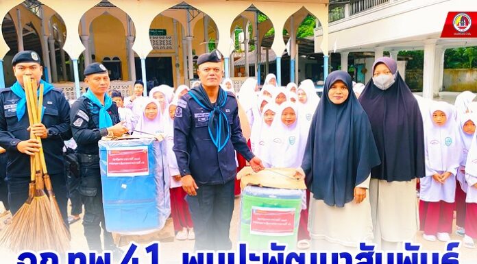 ฉก.ทพ.41 พบปะพัฒนาสัมพันธ์ มอบอุปกรณ์การเรียนและอุปกรณ์ทำความสะอาดให้กับศูนย์การศึกษาอิสลามประจำมัสยิด อำเภอรามัน จังหวัดยะลา