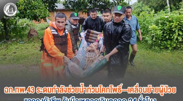 ฉก.ทพ.43 ระดมกำลังช่วยน้ำท่วมโคกโพธิ์—เคลื่อนย้ายผู้ป่วย แจกถุงยังชีพ รับมือเหตุฉุกเฉินตลอด 24 ชั่วโมง