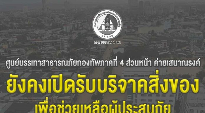 ศูนย์บรรเทาสาธารณภัยกองทัพภาคที่ 4 ส่วนหน้า ค่ายเสนาณรงค์ ยังคงเปิดรับบริจาคสิ่งของเพื่อช่วยเหลือผู้ประสบภัยในพื้นที่ อ.หาดใหญ่ จ.สงขลา อย่างต่อเนื่อง