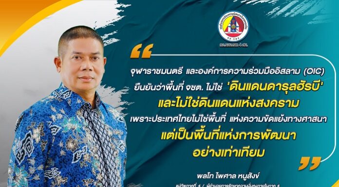 ” … จุฬาราชมนตรี และองค์การความร่วมมืออิสลาม (OIC) ยืนยันว่าพื้นที่ จชต. ไม่ใช่ ‘ดินแดนดารุลฮัรบี’ และไม่ใช่ดินแดนแห่งสงคราม เพราะประเทศไทยไม่ใช่พื้นที่ แห่งความขัดแย้งทางศาสนา แต่เป็นพื้นที่แห่งการพัฒนา อย่างเท่าเทียม … “