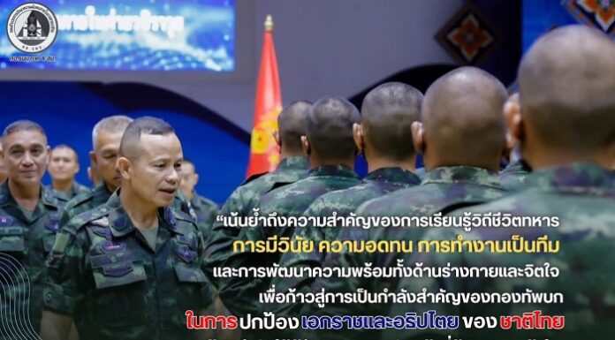 "...เน้นย้ำถึงความสำคัญของการเรียนรู้วิถีชีวิตทหาร การมีวินัย ความอดทน การทำงานเป็นทีม และการพัฒนาความพร้อมทั้งด้านร่างกายและจิตใจ เพื่อก้าวสู่การเป็นกำลังสำคัญของกองทัพบก ในการปกป้องเอกราชและอธิปไตยของชาติไทย พร้อมกำชับให้ผู้ฝึกทุกนายปฏิบัติหน้าที่ด้วยความเเข้าใจ เอาใจใส่ และเป็นแบบอย่างที่ดีแก่ทหารใหม่ ซึ่งเปรียบเสมือน “น้องคนเล็กของกองทัพบก...”
